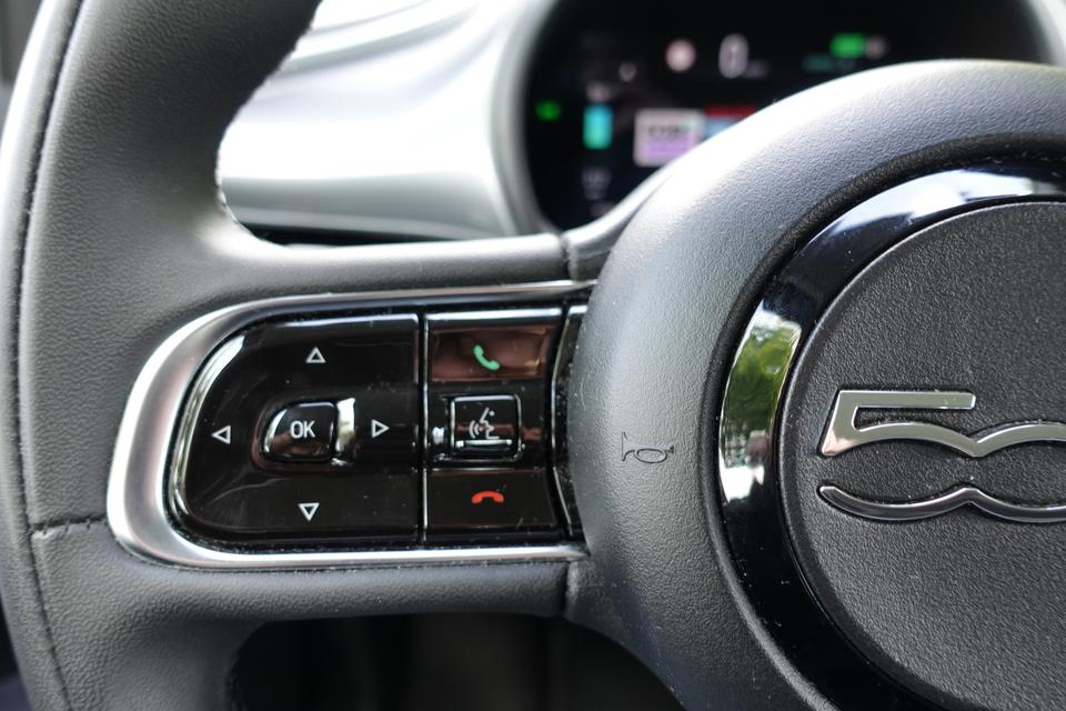 U kunt het audiosysteem met DAB-ontvangst en het full map navigatiesysteem bedienen met de knoppen op het stuur. Deze Fiat 500 is een complete auto anno nu, en dat merk je. Bijvoorbeeld door de aanwezige draadloze oplaadmogelijkheid voor telefoons. Dankzij automatische airconditioning is het interieur behaaglijk warm of verfrissend koel. Het drukke verkeer eist onderweg al uw aandacht op. Daarom is het goed dat deze Fiat is voorzien van diverse systemen die u assisteren tijdens de rit. Een automatisch inschakelbare verlichting neemt het waar als het donker wordt of gaat schemeren, en schakelt dan automatisch de verlichting in. Op dezelfde manier "ziet" de regensensor de eerste spatjes regen en schakelt dan de ruitenwissers in, en als het harder gaat regenen zet hij de ruitenwissers ook in een snellere stand. De contactsleutel is bij deze auto verleden tijd. De keyless start zorgt ervoor dat een druk op de knop voldoende is. Ook verstelbaar stuur en automatisch dimmende binnenspiegel zijn aan boord.