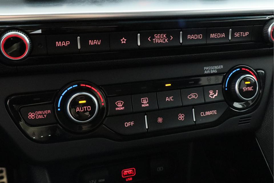 Met de achteruitrijcamera ziet u wat er achter de auto gebeurt. Zo rijdt u moeiteloos achteruit. Adaptive cruise control is een comfortabele en veilige optie. Het systeem reguleert de snelheid en houdt automatisch afstand tot uw voorligger. Laat u onderweg niet afleiden, de bediening van het audiosysteem en ook het full map navigatiesysteem gaat met knoppen op het stuur. Natuurlijk is de audio-installatie voorzien van DAB-ontvangst. Natuurlijk is er ook automatische airconditioning aanwezig. Natuurlijk is een complete auto als deze ook voorzien van sensoren die de omgeving in de gaten houden. Deze Kia heeft niet alleen een automatisch inschakelbare verlichting aan boord, maar ook een regensensor. Deze auto is voorzien van schakelpaddles aan het stuur, keyless entry, automatisch dimmende binnenspiegel, bagage afdekhoes en lederen versnellingspook.