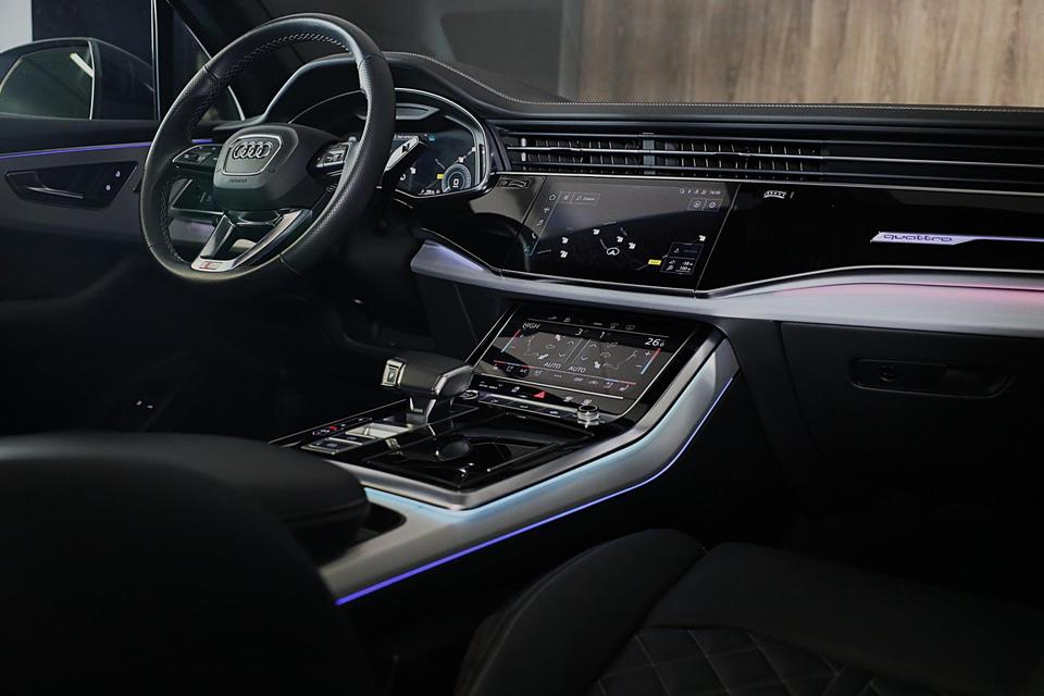Auto's als deze Audi Q7 bieden tegelijk rijdynamiek, comfort en degelijkheid. De verschillende elementen van de S line exterieur styling accentueren de dynamische lijnvoering van deze Q7. De aandrijving wordt verzorgd door een zescilinder motor en een automatische transmissie. De luchtvering levert niet alleen meer comfort, maar draagt tevens bij aan de veiligheid. De lederen bekleding geeft het interieur een hoogwaardige uitstraling. Deze Audi Q7 legt bestuurder én bijrijder compleet in de watten. De verwarmbare voorstoelen zijn voorzien van massagefunctie. Neem plaats op de comfortabele stoelen. Dankzij de elektrische bediening en het geheugen is het eenvoudig om hierin de beste zitpositie te vinden. Het interieur glanst in daglicht door het elektrisch bedienbare panoramadak. Met een druk op de knop gaat de elektrische achterklep open. Tot de uitrusting van deze Audi behoren ook open dak, 18 inch lichtmetalen velgen, LED koplampen, warmtewerend glas, zwarte hemelbekleding en dakspoiler.