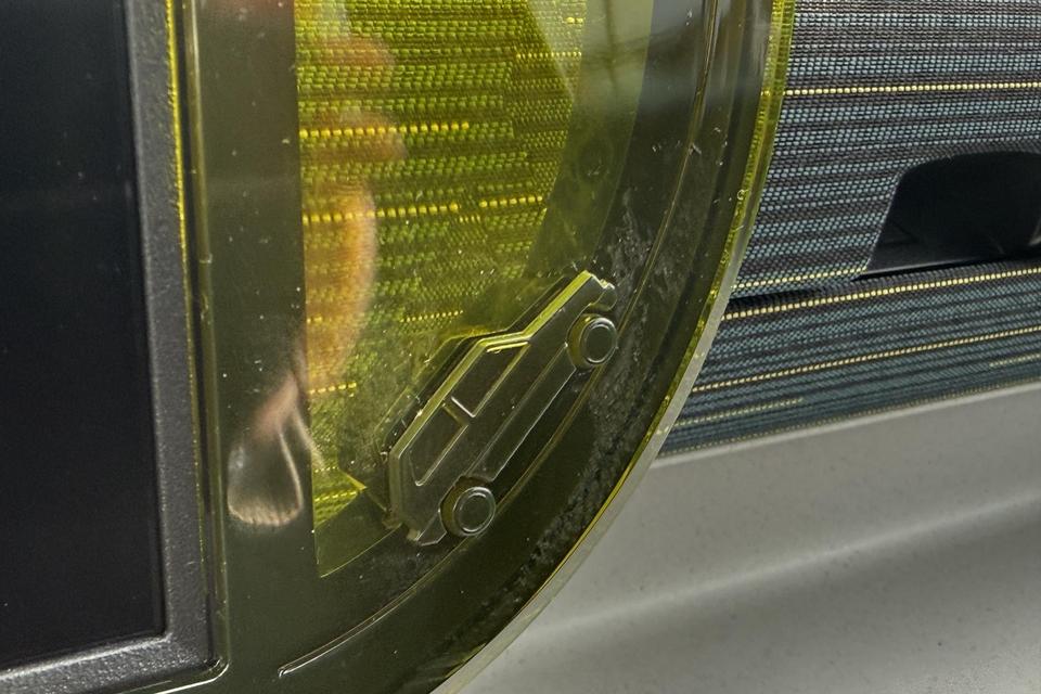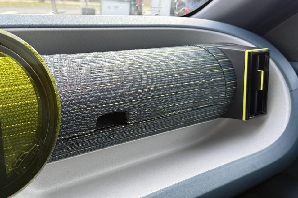 Interieur: Blauwe stof met gele stiksels én panda-logo, StofMilieu