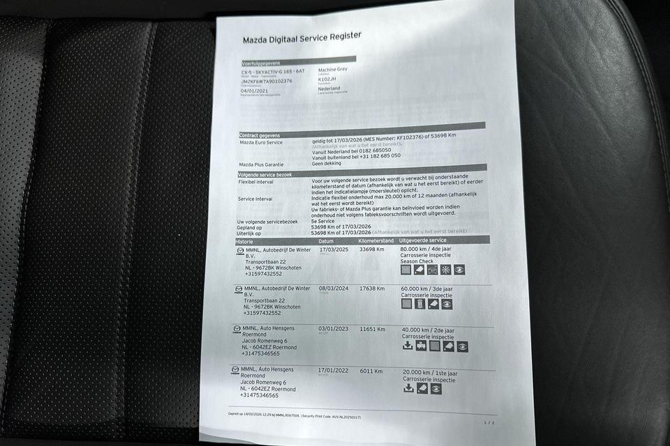 Omdat rijden een plezier mag zijn, staat deze Mazda CX-5 enthousiast te glimmen in de showroom. Technisch in topconditie, strak in de lak... echt een droomauto! De aandrijving van deze Mazda wordt verzorgd door een viercilinder benzinemotor en een automatische transmissie. Basisuitvoering? Niks daarvan! Deze komt met lederen interieur, een elektrisch bediende glazen panorama dak en een elektrisch bedienbare achterklep. U zult absoluut de luxe waarderen van de stoelverwarming, verwarmbare achterbank, en het verwarmbare stuur dat inbegrepen is in dit voertuig. Bij de uitrusting van deze Mazda horen onder meer LED koplampen, dakspoiler, extra getint glas, in delen neerklapbare achterbank, LED-achterlichten en verstelbare lendensteunen.